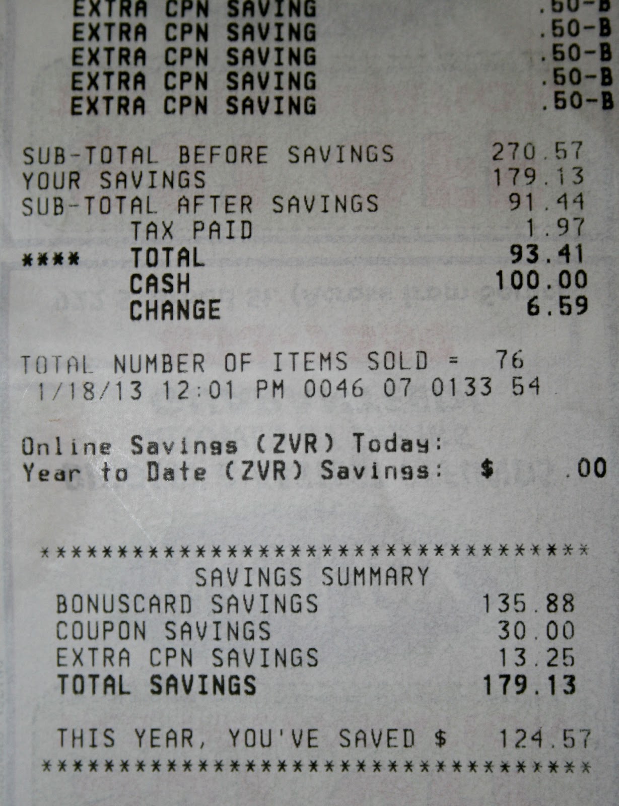So here is my January 18th shopping trip…please, someone explain to me how I saved 179.13 but in the THIS YEAR YOU’VE SAVED section it says I saved 124.57. Maybe I am having an airhead moment, but I haven’t figured it out.